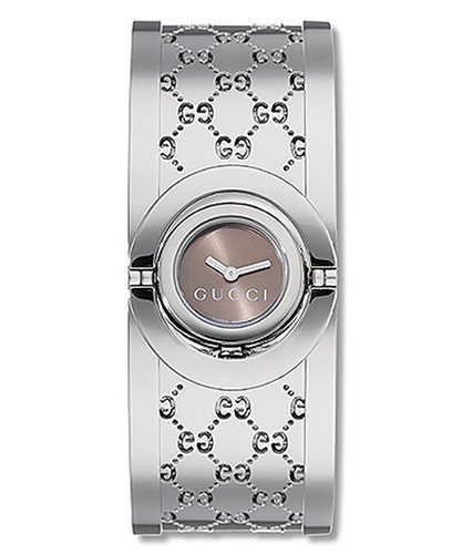 Elegant and eclectic, the Twirl watch #YA112501 from Gucci is all about streamlined artistry. This lovely dress accessory features a polished stainless steel case, crown, and bezel with sphere accents. Silver-tone hands brighten up the understated brown dial, while a bangle bracelet strap with logo design offers the perfect finishing touch. Playful yet sophisticated, this Gucci original boasts the precision of Swiss quartz movement and is water resistant to 99 feet..../ Gucci Women's YA112501 Twirl Watch / Silver Diamond Watches